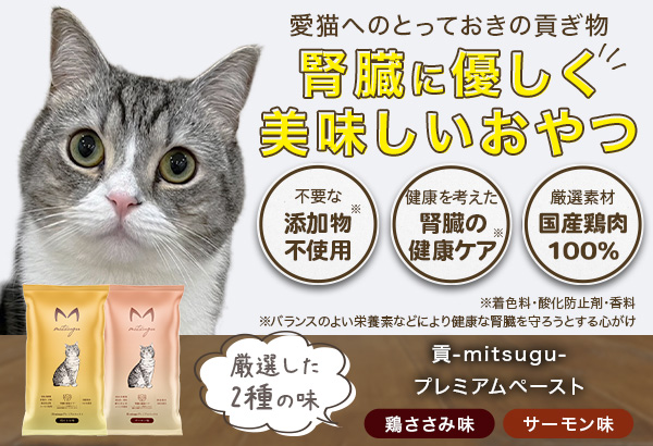 当商品は、腎臓の健康※に配慮し、飼い主が愛猫に気兼ねなくおやつを与えることができるよう、3つのサプリメントを配合。