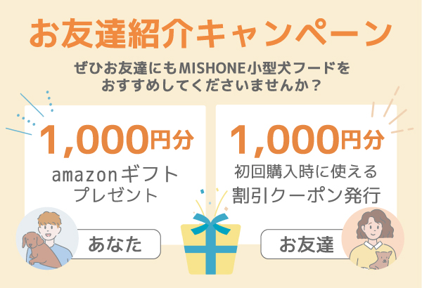この度、ミシュワンでは「小型犬用プレミアムフード」をもっとたくさんの方に知っていただくために、お友達紹介キャンペーンを開始いたしました。